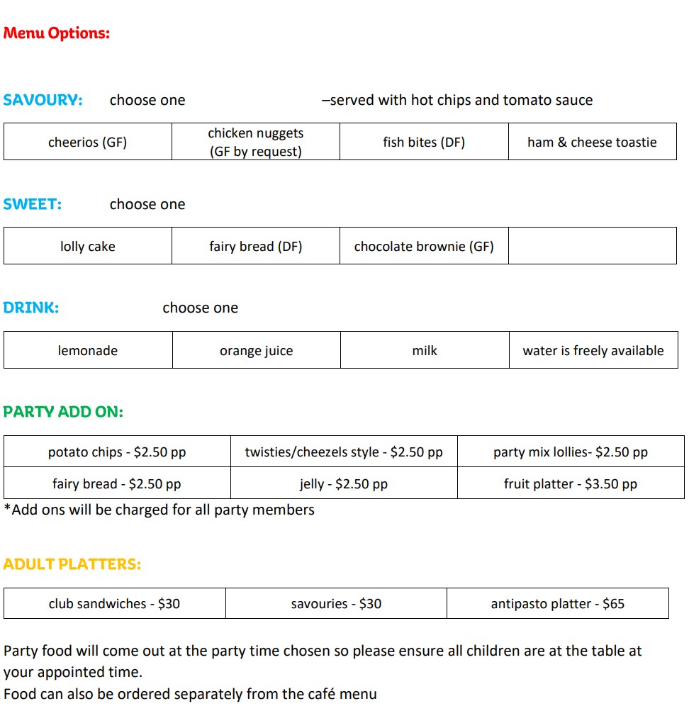 All children at the party need to eat the same food – individual choices are not available. ie: if one person needs gluten free, choose the GF options for the party