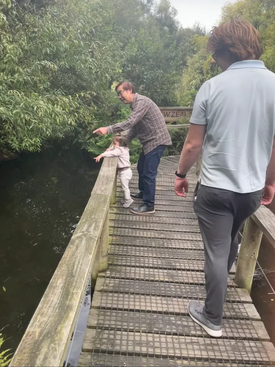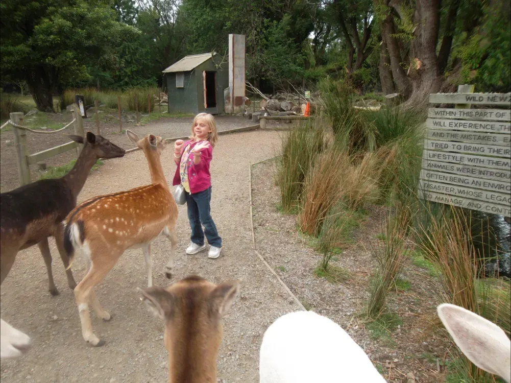 My grandaughters first visit to NZ from America 2012, the deer ran free at this time and follwed her for food and Monkey Island was newly built. -Elizabeth Mckenna